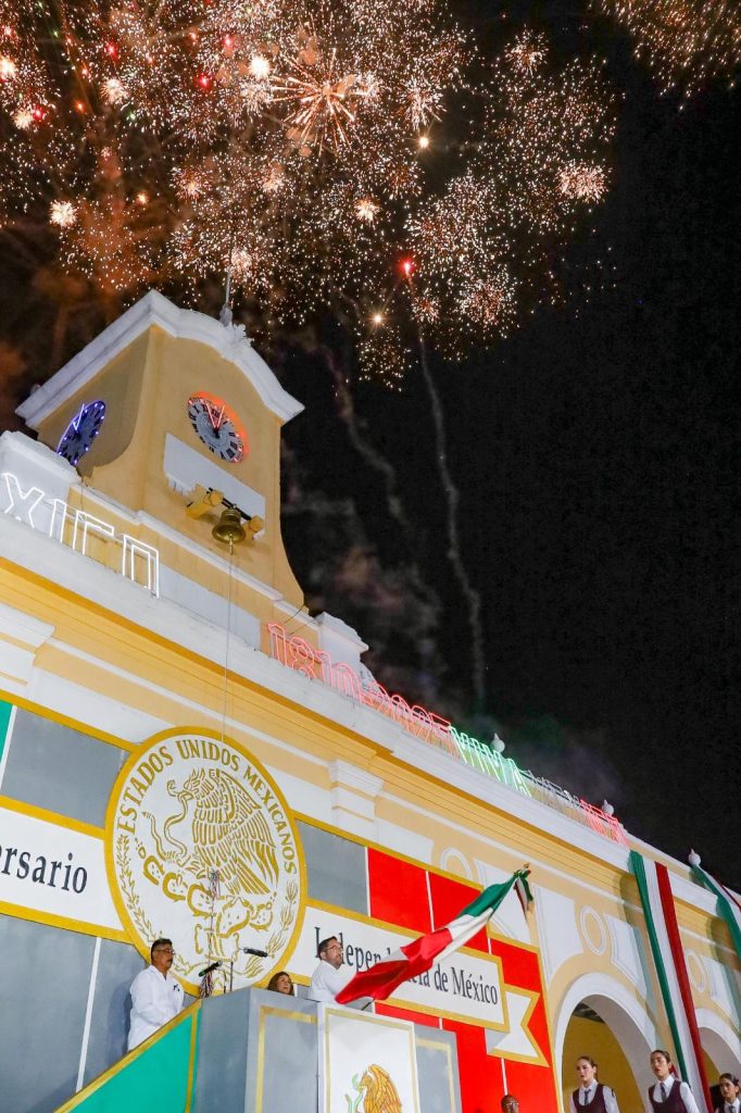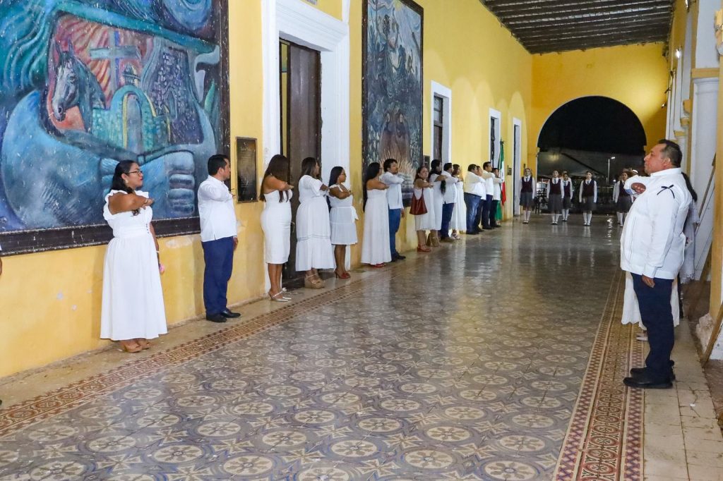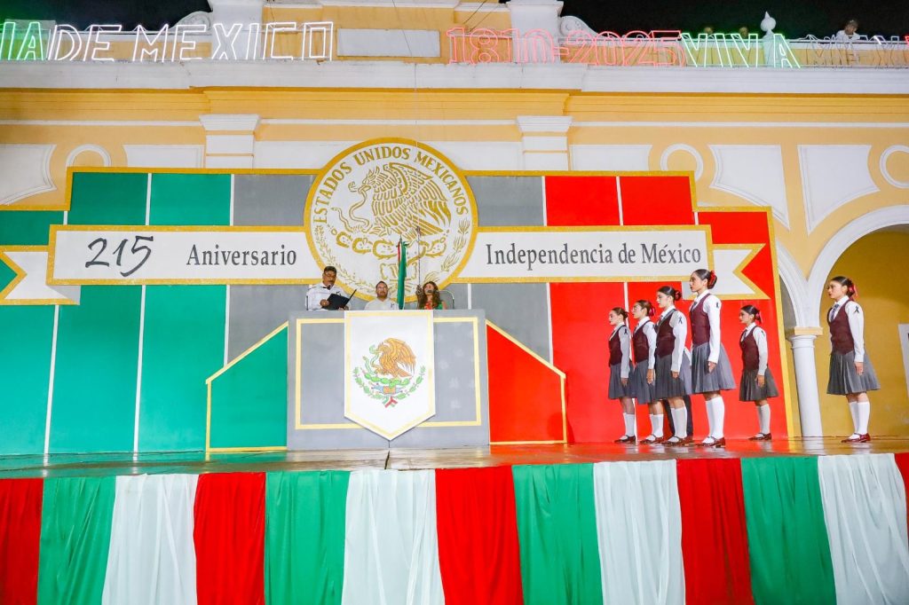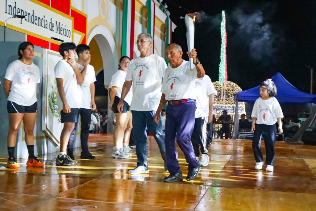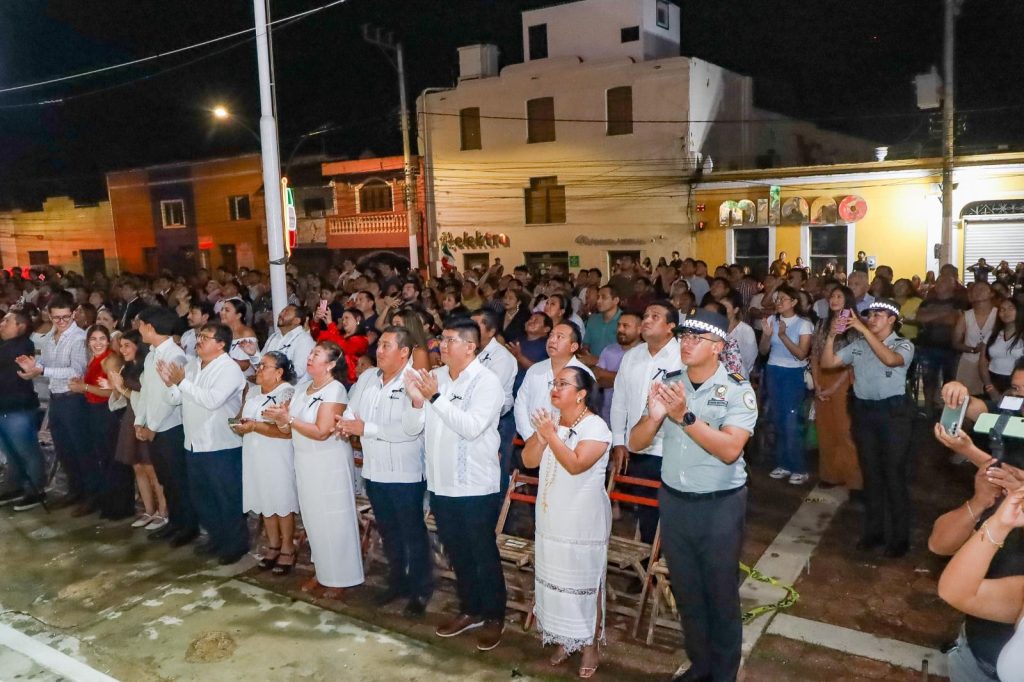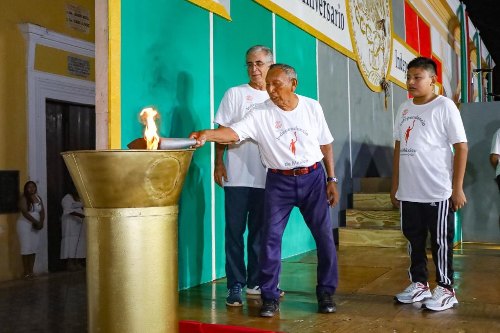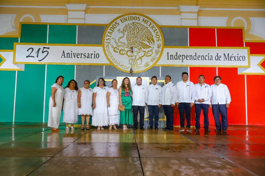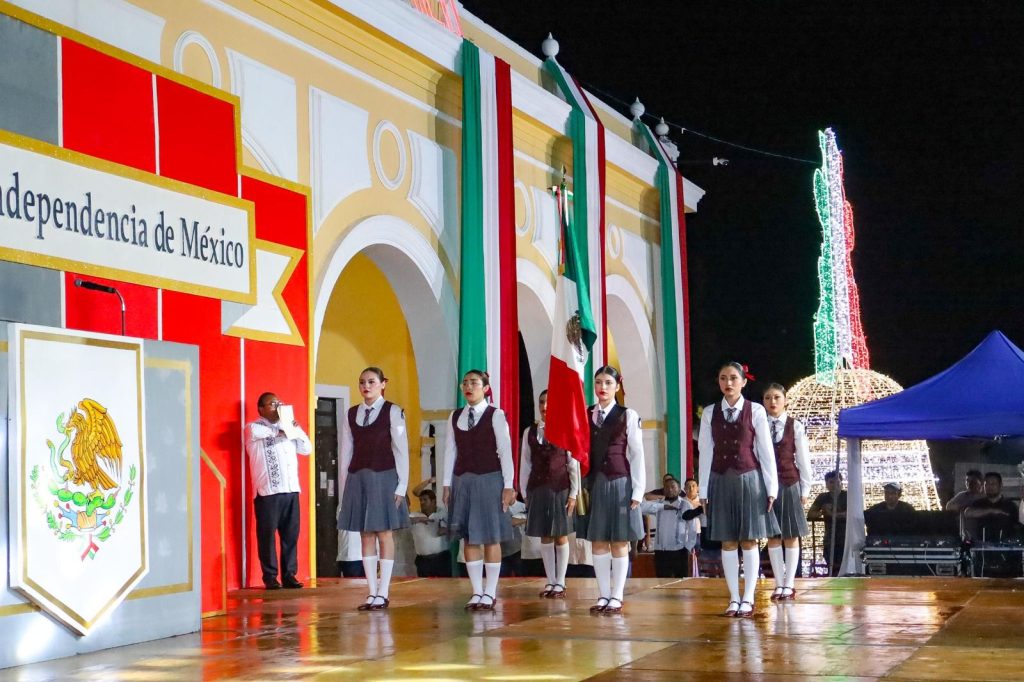 La velada patriótica incluyó además un programa artístico con la presentación de talentos locales, la participación de los comediantes yucatecos “Los Chetos Herrera”, así como la tradicional entrada de la antorcha de la independencia y la presentación de grupo musical Versax.