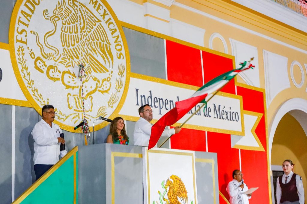 Acompañado de su esposa, la Mtra. Guadalupe González Canto, y del Secretario del H. Ayuntamiento, Profr. Joaquín Uc Kú, conmovido el alcalde repicó la campana, ondeó el lábaro patrio y proclamó con fuerza, junto a los presentes, el tradicional “¡Viva México!”, evocando la lucha y el legado de quienes dieron su vida por la independencia.